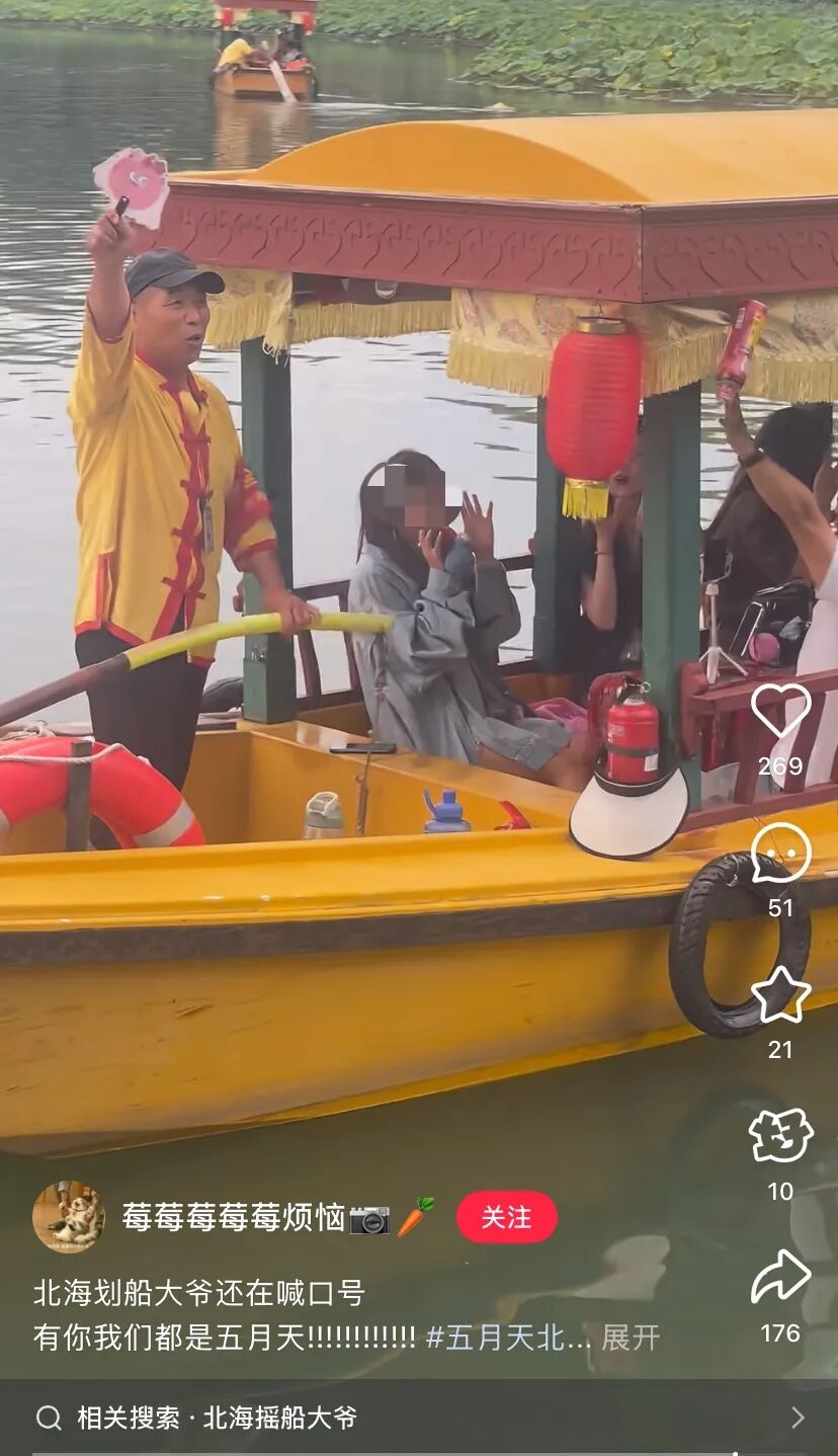 除了在著名景点投放五月天的IP装置「五球」(五月天乐团25周年巡回演唱会的标志性艺术装置,五个色彩不同的球代表五个成员),北京还为五月天粉丝准备了打卡路线。在「痛城」的氛围之下,粉丝成为城市文旅宣传的自来水,一位歌迷拍摄了北海开船大爷大喊「我们是五月天」并唱起《OAOA》的视频,这些UGC内容借助鲜活的人,让北京文旅呈现出更有趣的一面。